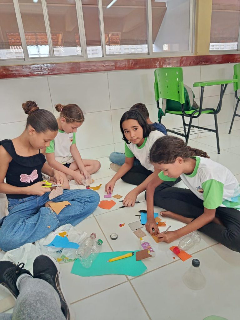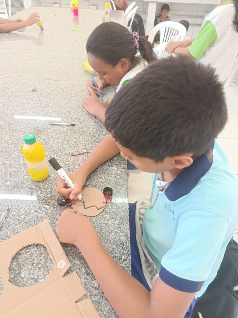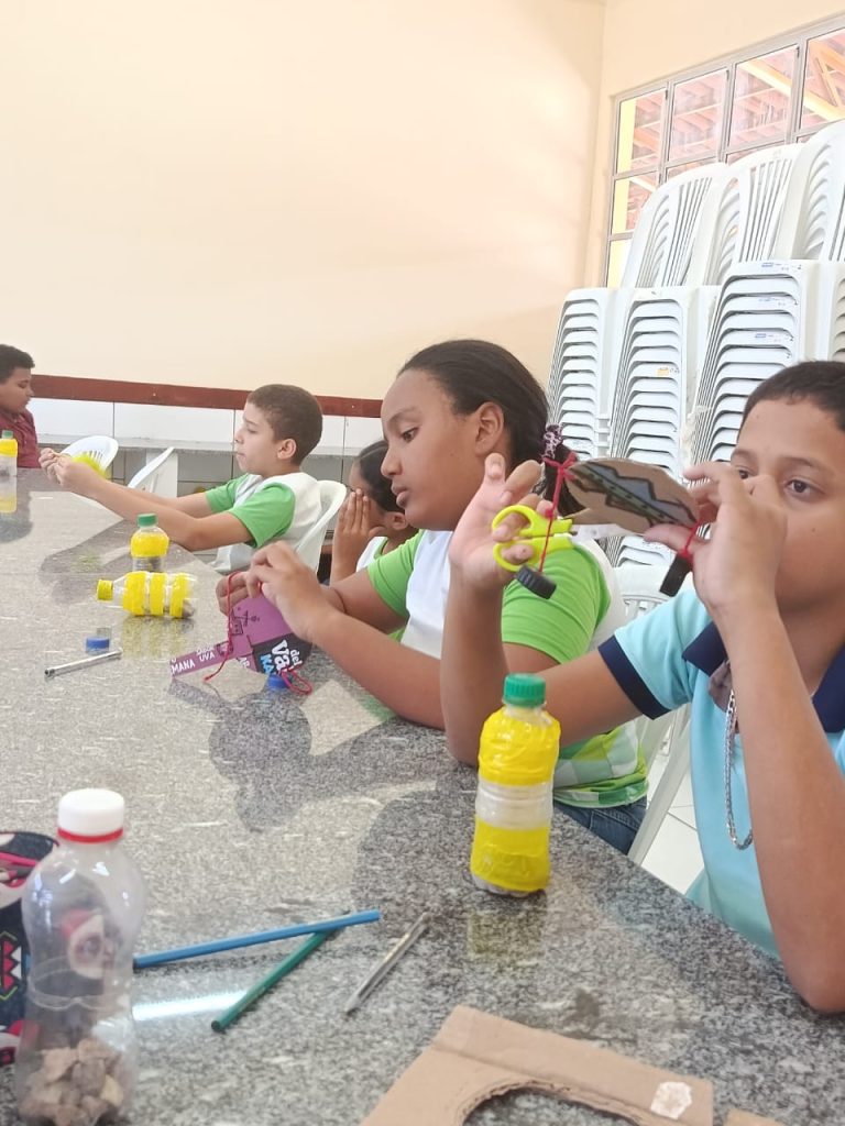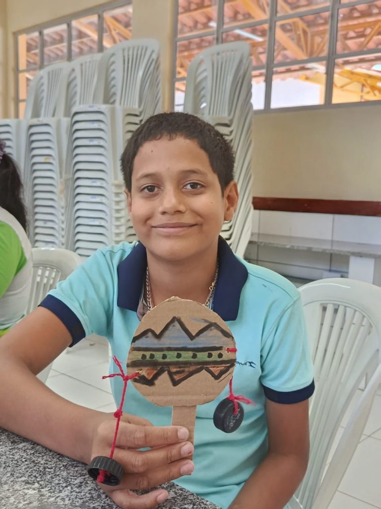 Além da luta, a professora também trabalhou brincadeiras da cultura indígena a partir da construção de brinquedos com materiais recicláveis. Os alunos levaram garrafas PET, papelão, canetas coloridas e tesouras sem ponta para montar: