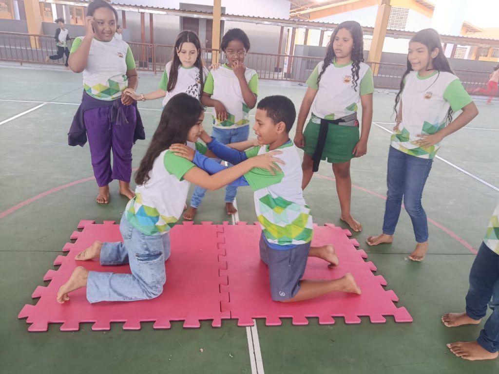 Com o contexto estabelecido, a aula seguiu para a quadra. Carmeleide propôs uma vivência lúdica da huka-huka, adaptando as regras e destacando equilíbrio, respeito e segurança para garantir a participação de todos, independentemente do porte físico. A luta tradicional é realizada na areia, mas a professora optou por usar tatames para evitar que os alunos se machucassem. Em duplas, eles se cumprimentavam, ajoelhavam-se, seguravam os ombros do colega e tentavam desequilibrá-lo. A empolgação foi tanta que, ao final da aula, pediram para repetir.