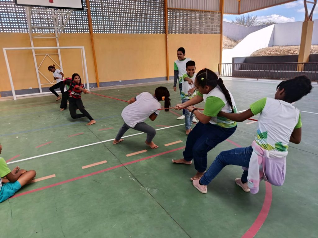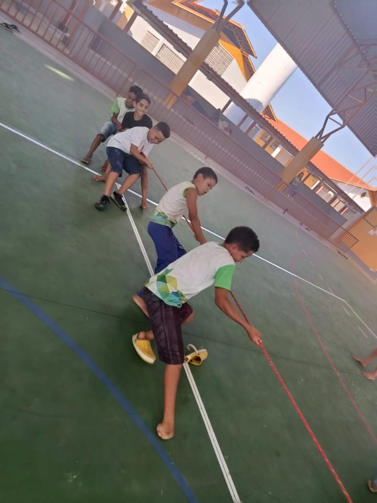Depois da confecção, Carmeleide explicou as regras e a turma partiu para as brincadeiras. Também exploraram jogos tradicionais de diferentes povos indígenas, como cabo de guerra, jogo de bila (bolinhas de gude), peteca, pião e “A onça e a galinha”. Nessa última, a criança que representa a onça fica no centro de um campo dividido ao meio. As demais, representando as galinhas, precisam atravessar o espaço correndo sem serem capturadas. A proposta é estimular agilidade, estratégia e, claro, muita diversão.