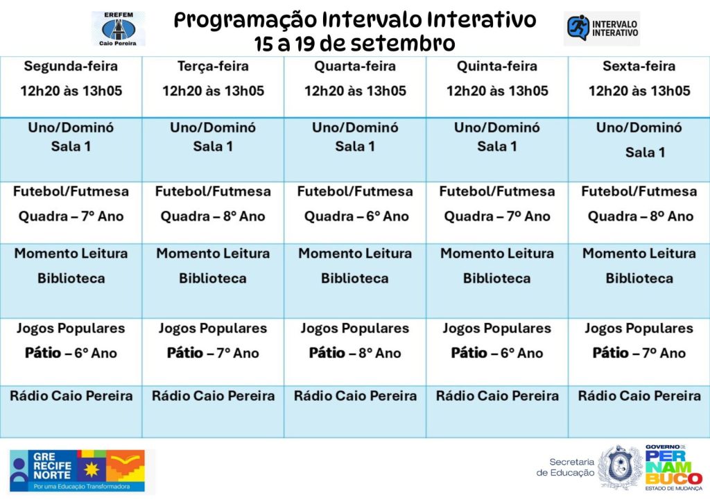 O sinal toca e, em vez de corredores silenciosos ou alunos vidrados no celular, a escola está movimentada: quadra ocupada com jogos, espaço de leitura, música no pátio e gincanas. Essa é a nova rotina dos estudantes da EREFEM Caio Pereira, em Recife (PE), onde o recreio deixou de ser apenas uma pausa para se tornar um momento planejado de esporte, cultura e lazer.